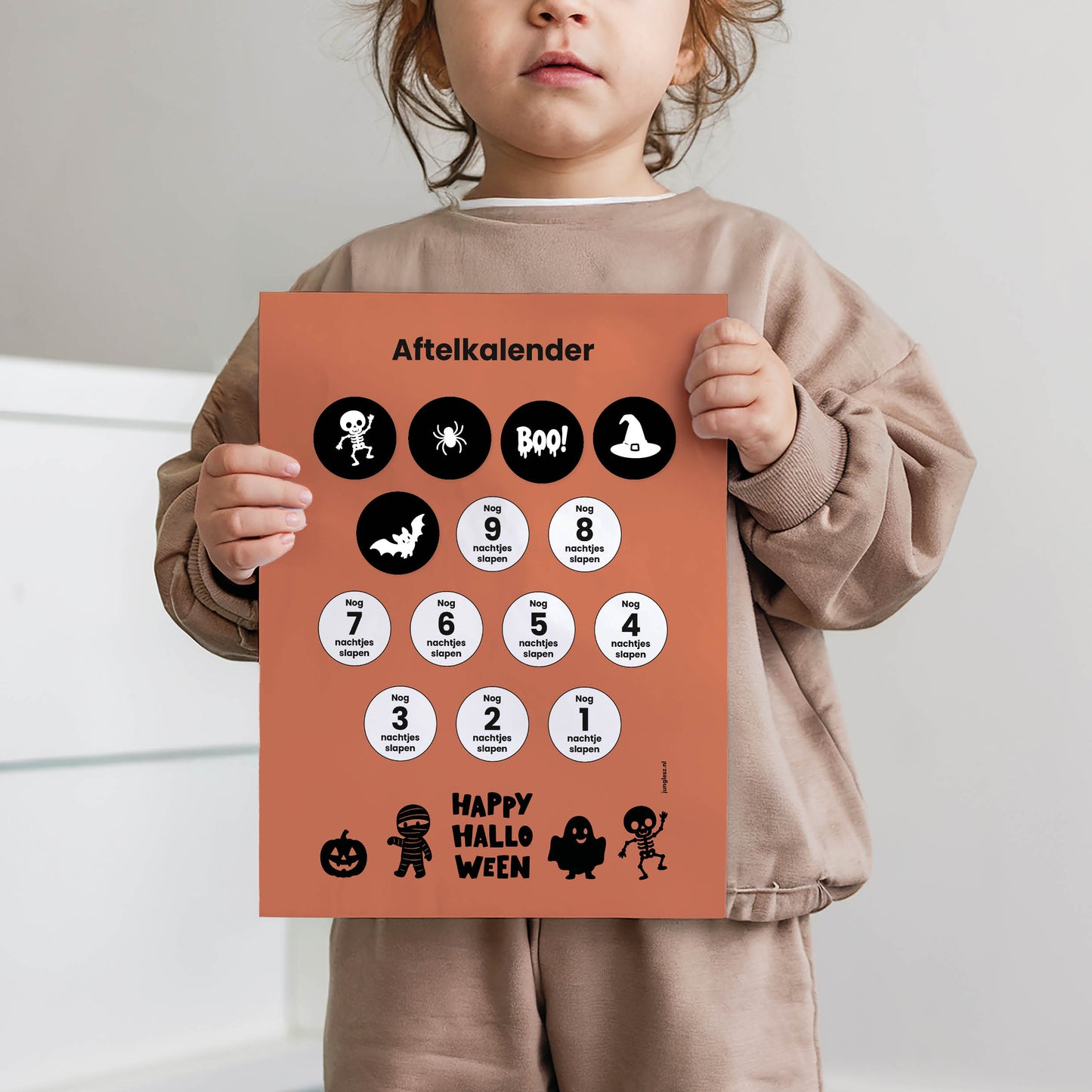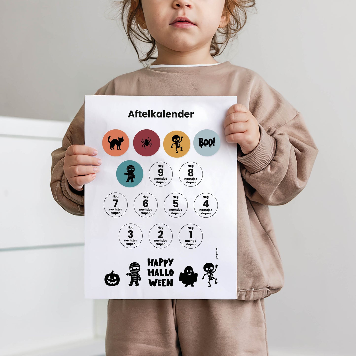 Aftellen werkt het best als het duidelijk, vriendelijk en voorspelbaar is. Daarom sluiten de stickers naadloos aan op de vormgeving van de aftelkalender(s): herkenbare icoontjes, zachte tinten en genoeg ademruimte. Zo blijft de lay-out kalm en voelt elke dag als een haalbaar stapje richting 31 oktober—of een andere mijlpaal. Kinderen zien in één oogopslag waar ze zijn, wat er komt en welke dagen extra bijzonder zijn.